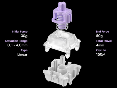 Keystroke Feel: Linear | Initial Activation Force: 30g | Total Activation Force: 50g | Actuation Range: 0.1 - 4.0mm | Stroke: 4.0mm | Lifespan: 150 million clicks