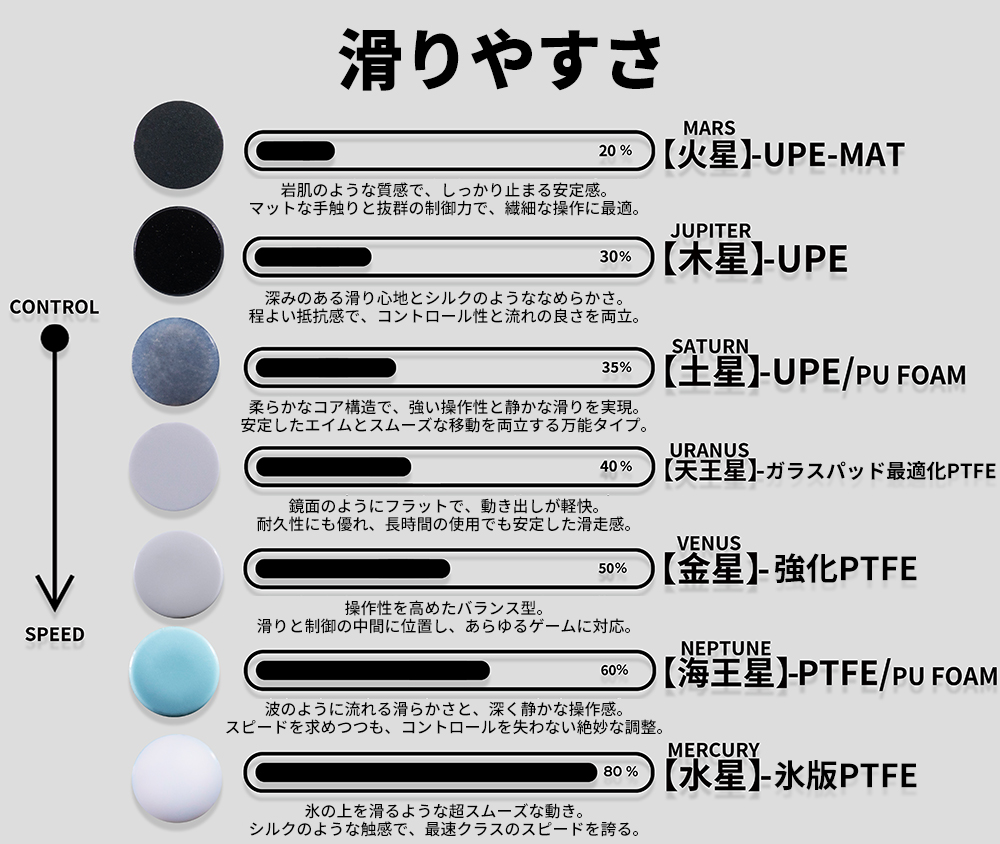 Choose the feel that suits you best, from the ice-like glide of "Mercury" to the stable control of "Mars."
