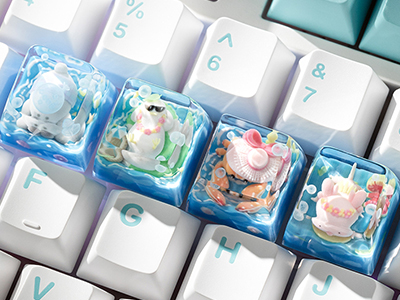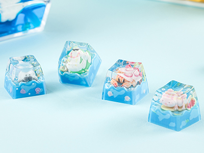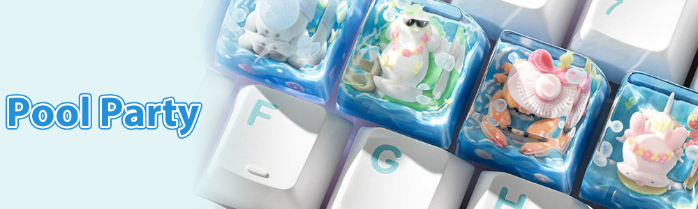 The "Pool Party" series of artisan keycaps features a pool motif with small animals floating happily.