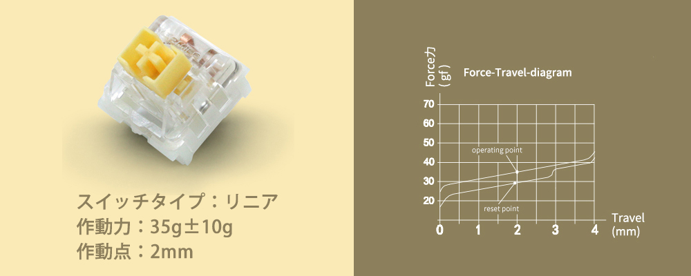 メカニカルスイッチの特徴である打鍵感と、静電容量式スイッチの信頼性と長寿命を兼ね備えた"いいとこ取り"のスイッチです。